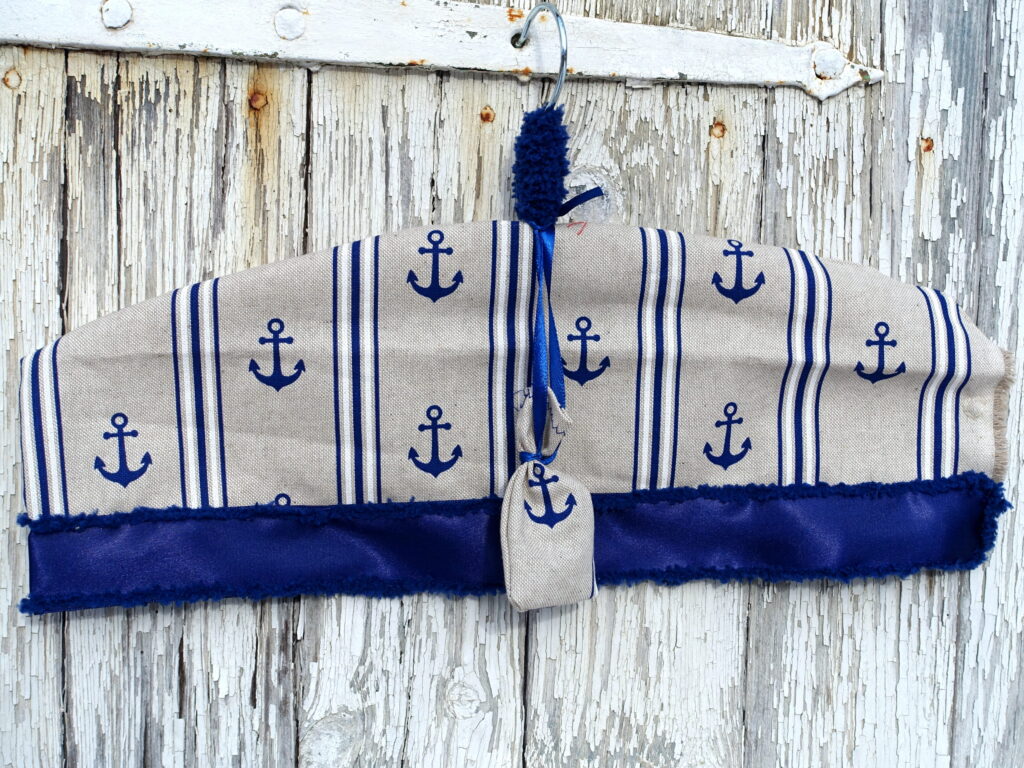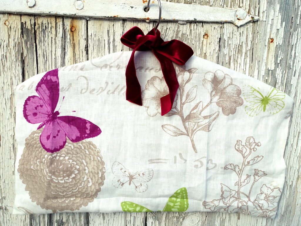 Die Holzkleiderbügel bekommen von mir eine selbstgenähte Stoffhülle. Eingearbeitet ist eine Öffnung, durch die ein Säckchen mit Lavendel hinein geschoben werden kann: So duftet das Kleidungsstück auf dem Bügel immer frisch! Einfach den Knopf öffnen, das Duftsäckchen hinein schieben und den Knopf schließen. Wer mag, nutzt das Geheimfach auch für andere Schätze!