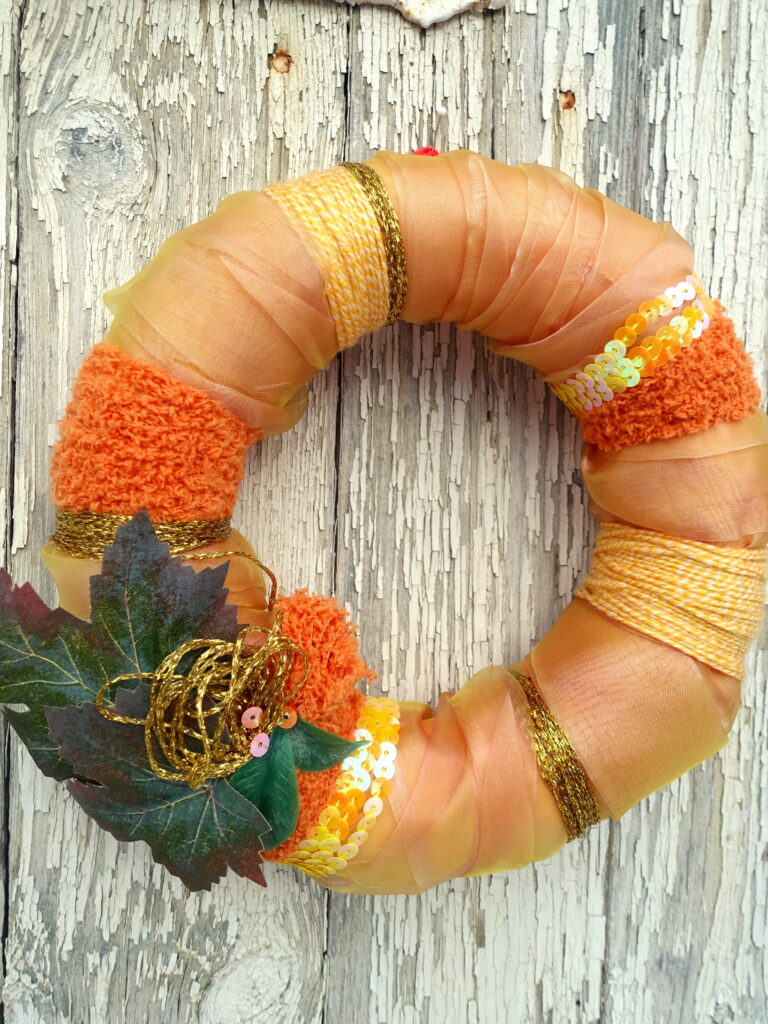 Sie bestehen aus einem Styroporrohling und wurden in Handarbeit mit Wolle, Stoffstreifen, Garnen und Paillettenband umwickelt.